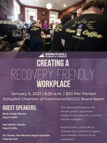 This educational seminar will identify policies and actions employers can take to be a recovery friendly workplace. Hope & Coffee, a local cafe in Tamaqua has a mission to support and normalize recovery in our community.Guest Speakers: