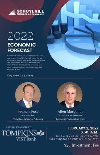 Following two years of uncertainty, find the certainty you need! Join the Schuylkill Chamber of Commerce as we host the 2022 Economic Forecast event, proudly sponsored by Tompkins VIST Bank.Keynote speakers, Allen Margolius and Francis Post of Tomkins Financial Advisors will lead us through a discussion of what to expect for the economy in 2022.
