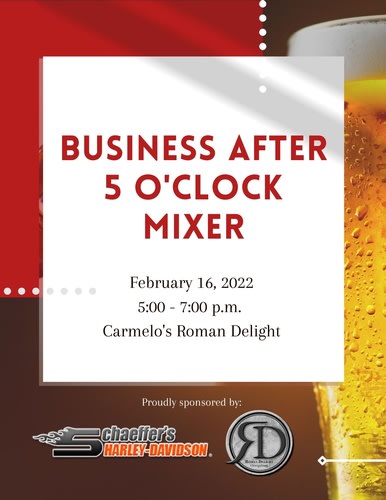 Join us for your next networking opportunity! This opportunity is proudly sponsored by Carmelo's Roman Delight and Schaeffer's Harley Davidson and Motorsport!Business After 5 O'clock Mixers are great opportunities to meet new people in our business community, learn about other businesses and nonprofits, and grow your professional network!