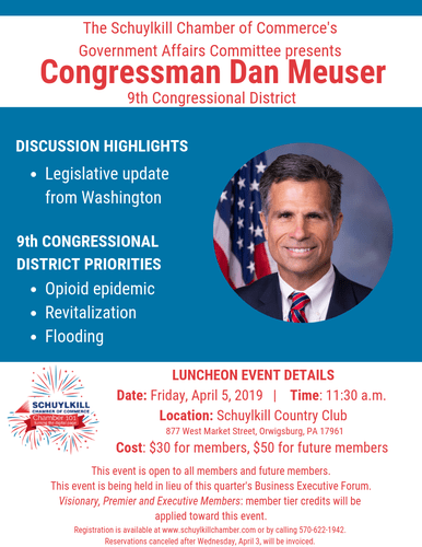 The Schuylkill Chamber of Commerce’s Government Affairs Committee will host a luncheon event featuring special guest, Congressman Dan Meuser at the Schuylkill Country Club in Orwigsburg, Pa.