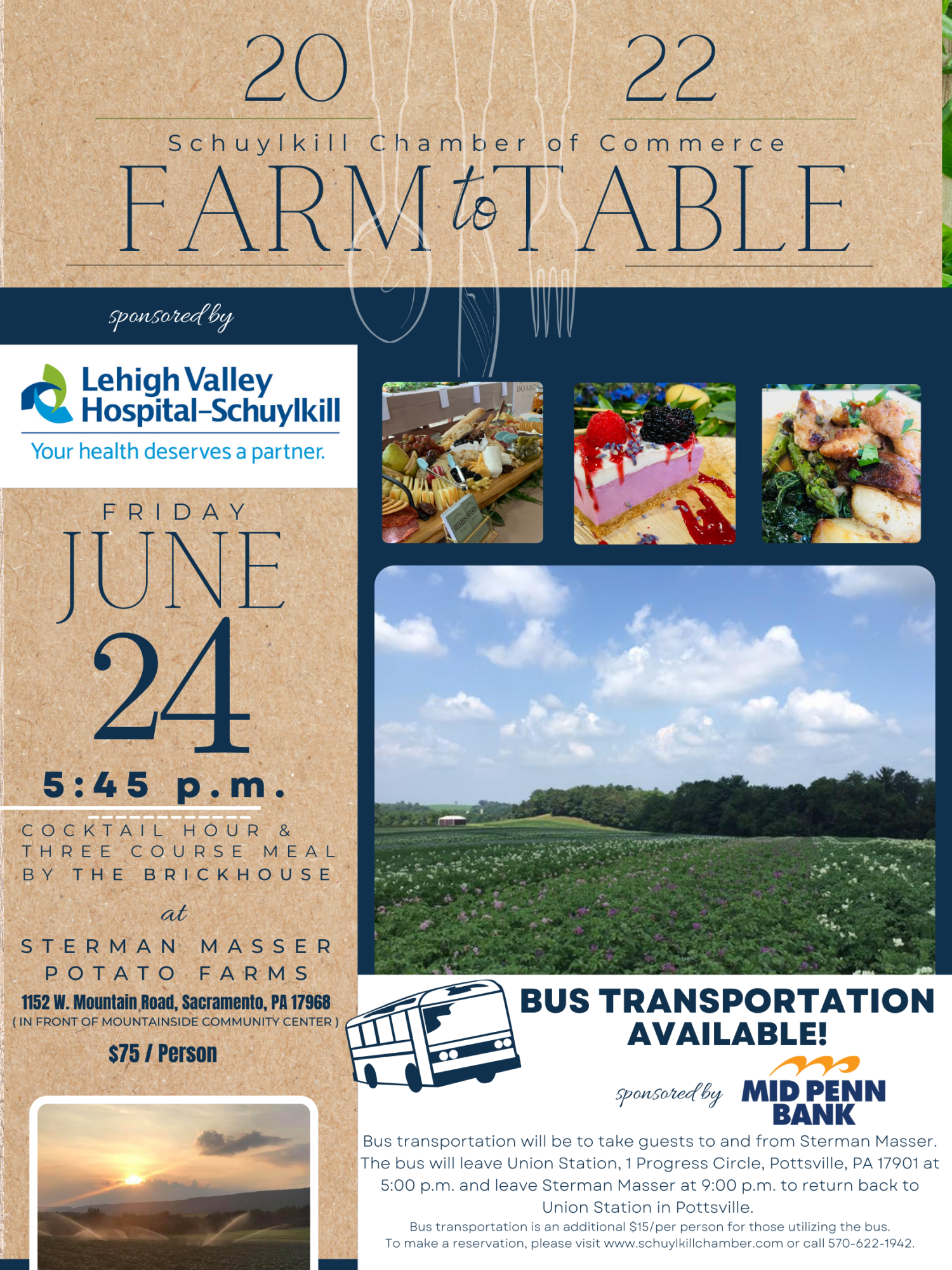 Join us at Sterman Masser Potato Farms for the 2022 Farm to Table event, which is proudly sponsored by Lehigh Valley Hospital - Schuylkill.