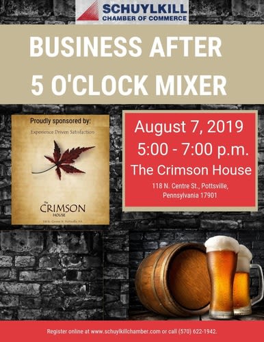 The next Business After 5 O'clock Mixer will be hosted and sponsored by The Crimson House in Pottsville.