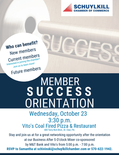 Our quarterly Business Success Orientation will be held on Wednesday, October 23, prior to the Business After 5 O'clock Mixer co-sponsored by M&T Bank & Vito's Coal Fired Pizza and Restaurant.This Member Success Orientation will outline how the Schuylkill Chamber of Commerce can help you, your business and your employees.