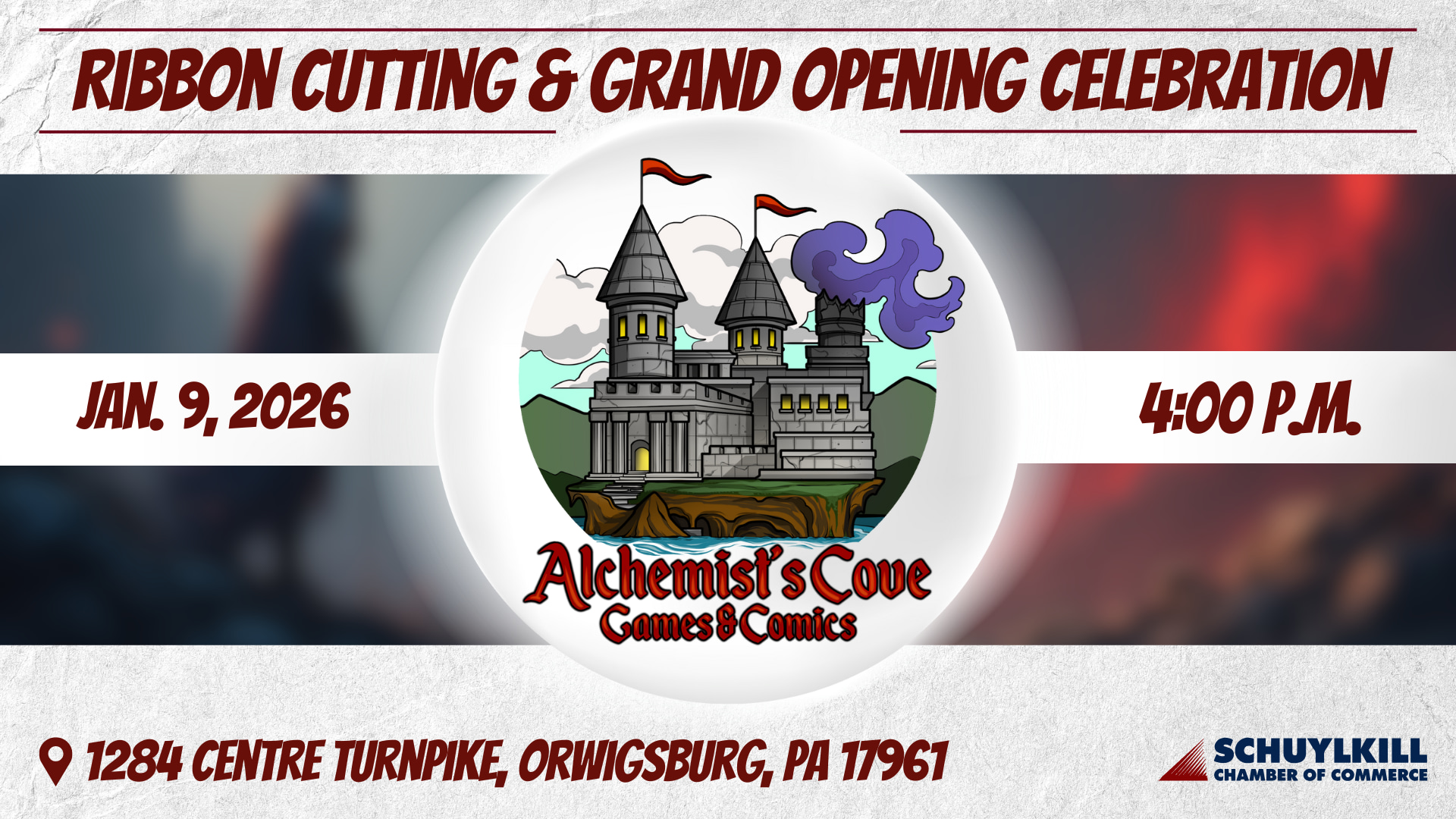 The Schuylkill Chamber of Commerce is excited to host a Grand Opening Celebration for Alchemist’s Cove Games & Comics at their new Orwigsburg location. Alchemist’s Cove is a locally owned hobby and gaming store offering comics, board games, card games, tabletop miniatures, and open play space for the community. Join us as we welcome this growing small business to Orwigsburg, explore the new space, and celebrate a business dedicated to bringing people together through creativity, games, and shared experiences.