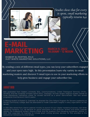 By sending a mix of different email types, you can keep your subscribers engaged and your open rates high. In this presentation learn why variety in email marketing matters and discover 9 email types to use in your marketing efforts to help grow business and engage your subscriber list.This seminar will be held in person and on Zoom.