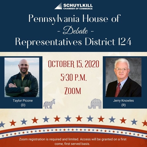 The Schuylkill Chamber of Commerce will host a Pennsylvania House of Representatives District 124 Debate via Zoom between Taylor Picone (D) and Jerry Knowles (R).Zoom registration is required and limited. Access will be granted on a first come-first served basis.