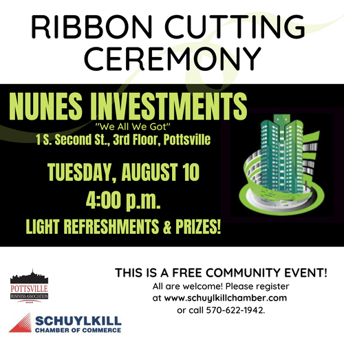 Join the Schuylkill Chamber of Commerce and Pottsville Area Business Association to celebrate the opening of Nunes Investments, LLC office space in Pottsville.Light refreshments and prizes!