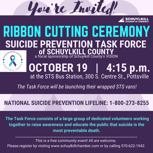 The Schuylkill Chamber of Commerce invites you to join us at the Schuylkill Transportation System for the launch of the Suicide Prevention Task Force's wrapped vans.The Suicide Prevention Task Force of Schuylkill County (a fiscal sponsorship of Schuylkill County's VISION) is a group of dedicated volunteers working together to raise awareness and educate the public that suicide is the most preventable death. The Task Force works with our community to provide preventative items such as gun locks, present to organizations on the statistics of the County, explain who they are and what they do, offer training, distribute information and contact information to the National Lifeline (1-800-273-8255)